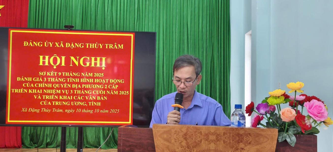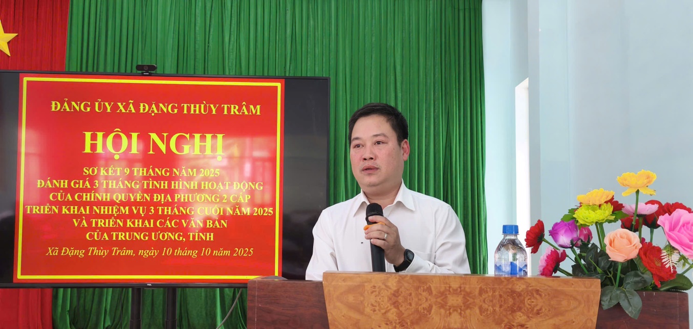Sáng ngày 10/10/2025, tại Nhà văn hóa xã, Đảng ủy xã Đặng Thùy Trâm tổ chức Hội nghị sơ kết 9 tháng năm 2025, đánh giá 3 tháng tình hình hoạt động của chính quyền địa phương 02 cấp, triển khai nhiệm vụ 3 tháng cuối năm 2025 và triển khai các văn bản của Trung ương, tỉnh. Nhằm đánh giá những kết quả đạt được trong 9 tháng đầu năm, 3 tháng tình hoạt động của chính quyền địa phương 2 cấp và triển khai nhiệm vụ 3 tháng cuối năm 2025, đồng thời quán triệt, triển khai các văn bản chỉ đạo mới của Trung ương, tỉnh.