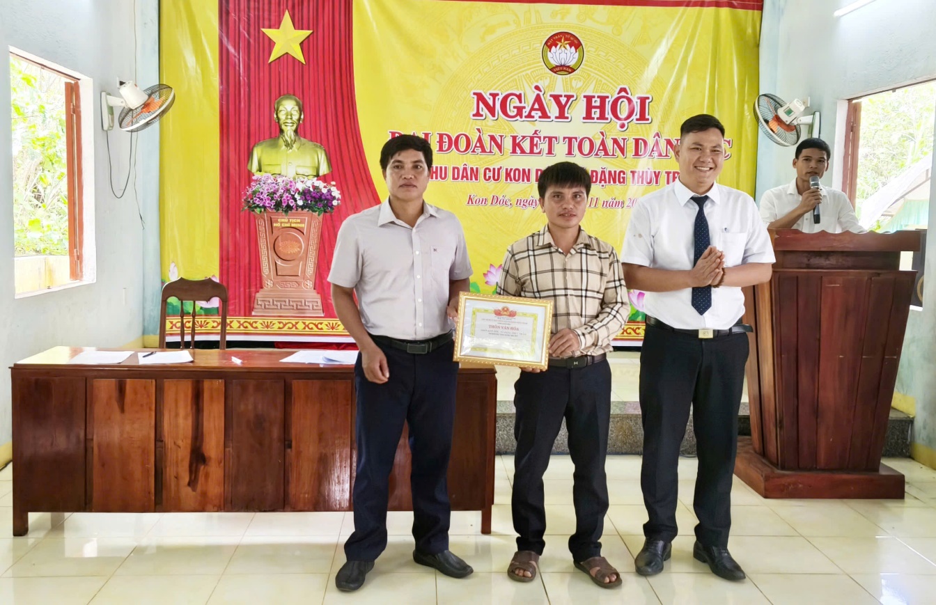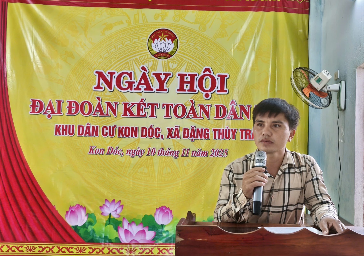 Tại Ngày hội, đồng chí Phạm Văn Hái - Trưởng thôn Kon Dóc đã báo cáo kết quả phong trào “Toàn dân đoàn kết xây dựng đời sống văn hóa” năm 2025. Hiện thôn có 171 hộ với 609 nhân khẩu; thu nhập bình quân ước đạt 18 triệu đồng/người/năm, tỷ lệ hộ nghèo giảm còn 12,5%. Phong trào văn hóa, văn nghệ, thể thao, khuyến học phát triển mạnh mẽ; an ninh trật tự được giữ vững; môi trường xanh – sạch – đẹp; 100% hộ có công trình vệ sinh hợp chuẩn. Năm 2025, thôn đạt danh hiệu “Thôn văn hóa”, với 94% hộ đạt gia đình văn hóa.