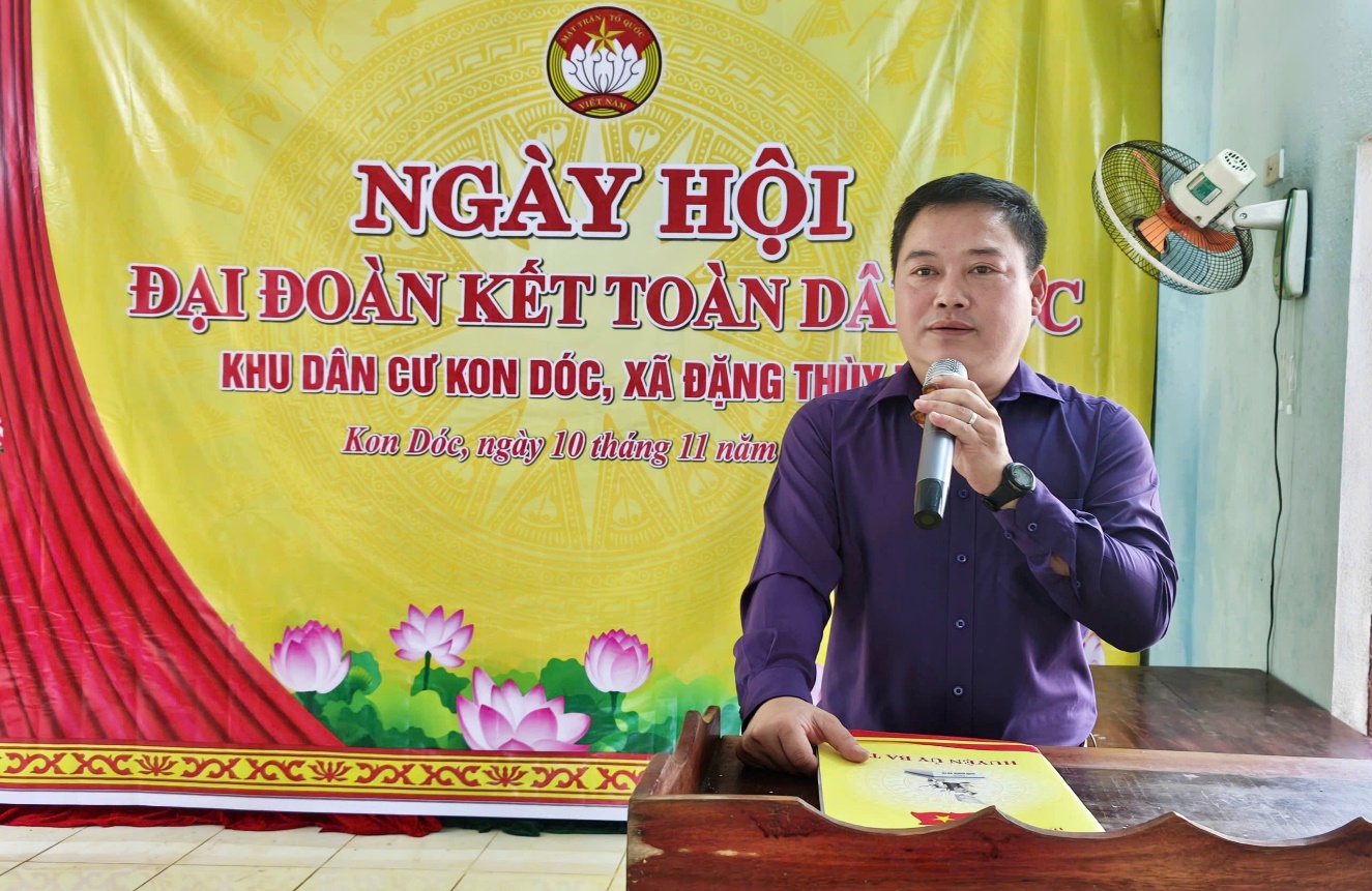 Phát biểu tại Ngày hội, đồng chí Lê Hữu Trinh, Bí thư Đảng ủy xã ghi nhận và biểu dương những thành tích mà cán bộ và nhân dân thôn Kon Dóc đã đạt được trong năm qua. Đồng chí đề nghị cán bộ, nhân dân trong thôn tiếp tục phát huy sức mạnh đại đoàn kết; đẩy mạnh phát triển kinh tế hộ gia đình; giữ gìn bản sắc văn hóa và nếp sống văn minh; chăm lo sự nghiệp giáo dục, công tác khuyến học; thực hiện tốt dân chủ ở cơ sở, tăng cường giám sát, phản biện xã hội; tích cực tham gia các hoạt động nhân đạo, từ thiện.