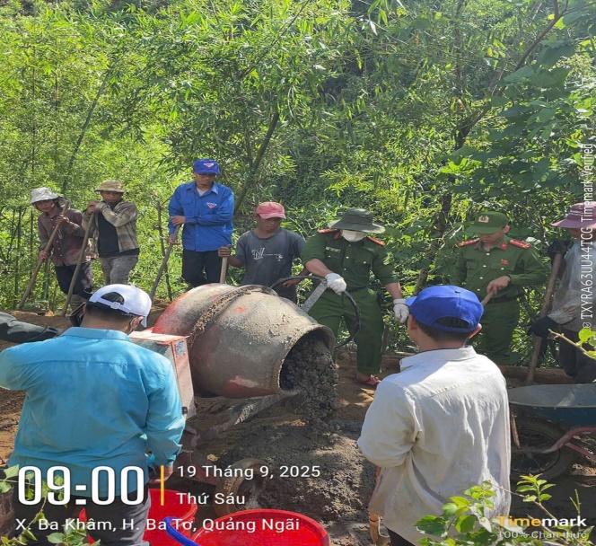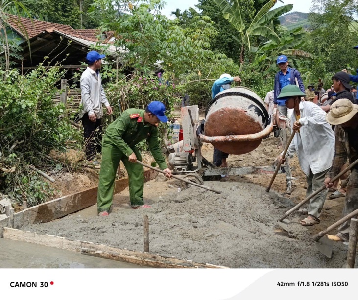 Cán bộ Công an xã tham gia hoạt động xây dựng đường bê tông nông thôn tại
